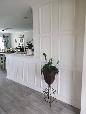 Promising review: "Moldings came in well-packed and quickly. It was super easy to install. Used White Lightning Speed Grip to adhere the panels. These panels gave a high-end look to an otherwise drab wall and peninsula. So classic and affordable and it will never go out of style!" —JM