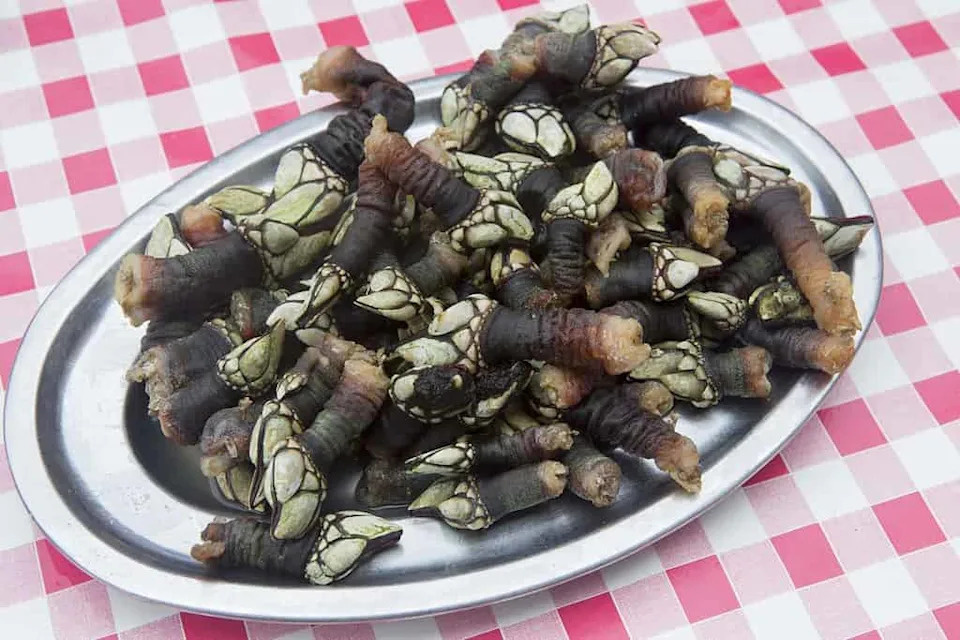 Goose barnacles are a rare seafood harvested by hand from rocky coastlines, where rough waves make collecting them dangerous.