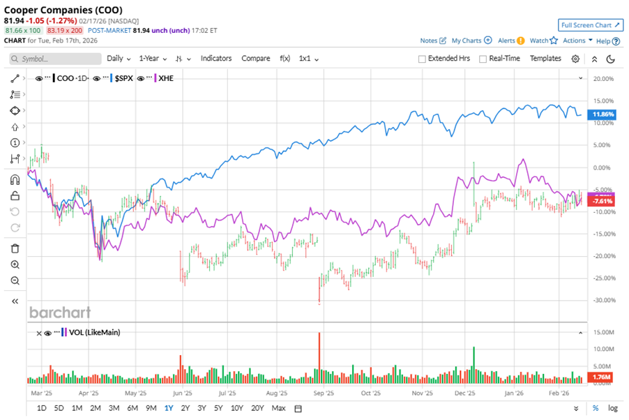 The Cooper Companies (COO), headquartered in San Ramon, California, develops, manufactures, and markets contact lens wearers. Valued at $16.3 billion by market cap, the company’s products include contact lenses for the vision care market and diagnostic products, surgical instruments, and accessories for gynecologists and obstetricians. Shares of this global medical device company have underperformed the broader market over the past year. COO has declined 7% over this time frame, while the broader S&P 500 Index ($SPX) has rallied nearly 11.9%. In 2026, COO stock is down marginally, aligning with SPX’s slight fall on a YTD basis. Cathie Wood Adds 210K Shares to a Rising AI Bet With Upside of 102% Is GOOG Stock a Buy Amid the Software Selloff? Broadcom Is ‘Sitting on a Sinking Iceberg.’ Why 1 Analyst Is Warning on AVGO Stock Here. Get exclusive insights with the FREE Barchart Brief newsletter. Subscribe now for quick, incisive midday market analysis you won't find anywhere else. Narrowing the focus, COO’s underperformance is also apparent compared to the SPDR S&P Health Care Equipment ETF (XHE). The exchange-traded fund has declined about 6.6% over the past year. However, the stock’s marginal losses on a YTD basis outshine the ETF’s 3.3% decline over the same time frame. On Dec. 4, 2025, COO shares closed up more than 1% after reporting its Q4 results. Its revenue was $1.07 billion, surpassing analyst estimates of $1.06 billion. The company’s adjusted EPS of $1.15 beat analyst estimates by 3.2%. For the current fiscal year, ending in October, analysts expect COO’s EPS to grow 9.5% to $4.51 on a diluted basis. The company’s earnings surprise history is impressive. It beat or matched the consensus estimate in each of the last four quarters. Among the 18 analysts covering COO stock, the consensus is a “Moderate Buy.” That’s based on 10 “Strong Buy” ratings, one “Moderate Buy,” six “Holds,” and one “Strong Sell.” This configuration is more bullish than a month ago, with nine analysts suggesting a “Strong Sell.” On Feb. 3, Needham kept a “Buy” rating on COO and lowered the price target to $99, implying a potential upside of 20.8% from current levels. The mean price target of $90.12 represents a 10% premium to COO’s current price levels. The Street-high price target of $100 suggests an upside potential of 22%. On the date of publication, Neha Panjwani did not have (either directly or indirectly) positions in any of the securities mentioned in this article. All information and data in this article is solely for informational purposes. This article was originally published on Barchart.com