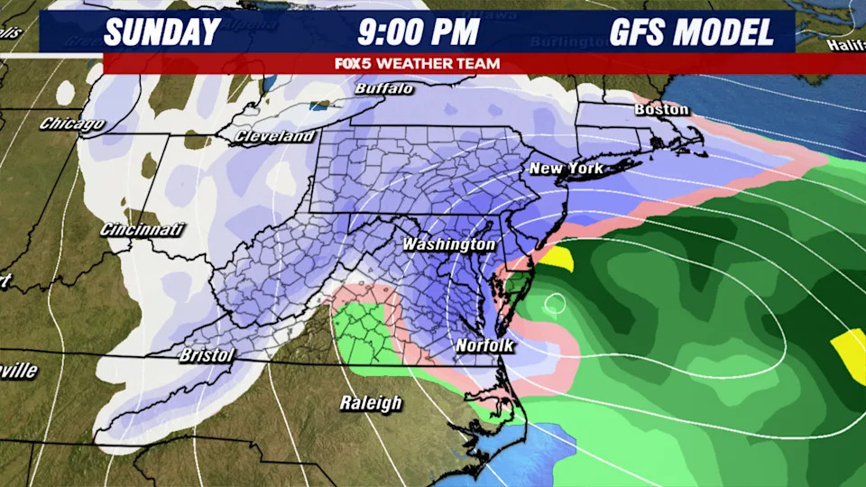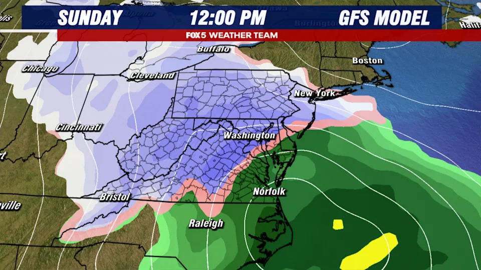 By Saturday night, the pattern does start to shift though, as a strong dip in the jetstream sends temperatures falling back into the 30s overnight Saturday into Sunday. At the same time, a storm system is forecast to develop ahead of this cold push, which could bring a wide range of precipitation to the D.C. region, including the threat for accumulating snowfall.