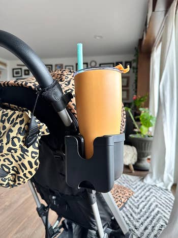 Promising review: "I ordered this with low hopes because I feel like stroller cup holders are always so flimsy. I'm extremely impressed with the quality of this cup holder! You can attach it to any bar, no matter the direction it goes, as it is adjustable. It was easy to attach. It holds my large 42-oz cup with no problem. I do have to remove my wallet from my phone to put in the phone compartment. I'll be ordering another for our leisure stroller!" —Jeanette Rojas
