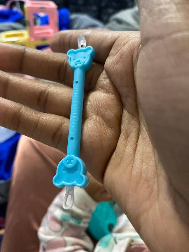 This tool is confusingly kinda cute even though its purpose is *a bit* gross — to remove earwax and boogers safely from little ones. Does my daughter fight us like she's starring in Gladiator when we try to use this on her? Yes. But does it get the job done faster and more easily? Also, yes! It's not an easy task because babies are VERY squirmy, but the Oogiebear (which comes from a small business, btw) definitely helps make the process go a bit more seamlessly. Absolutely recommend.