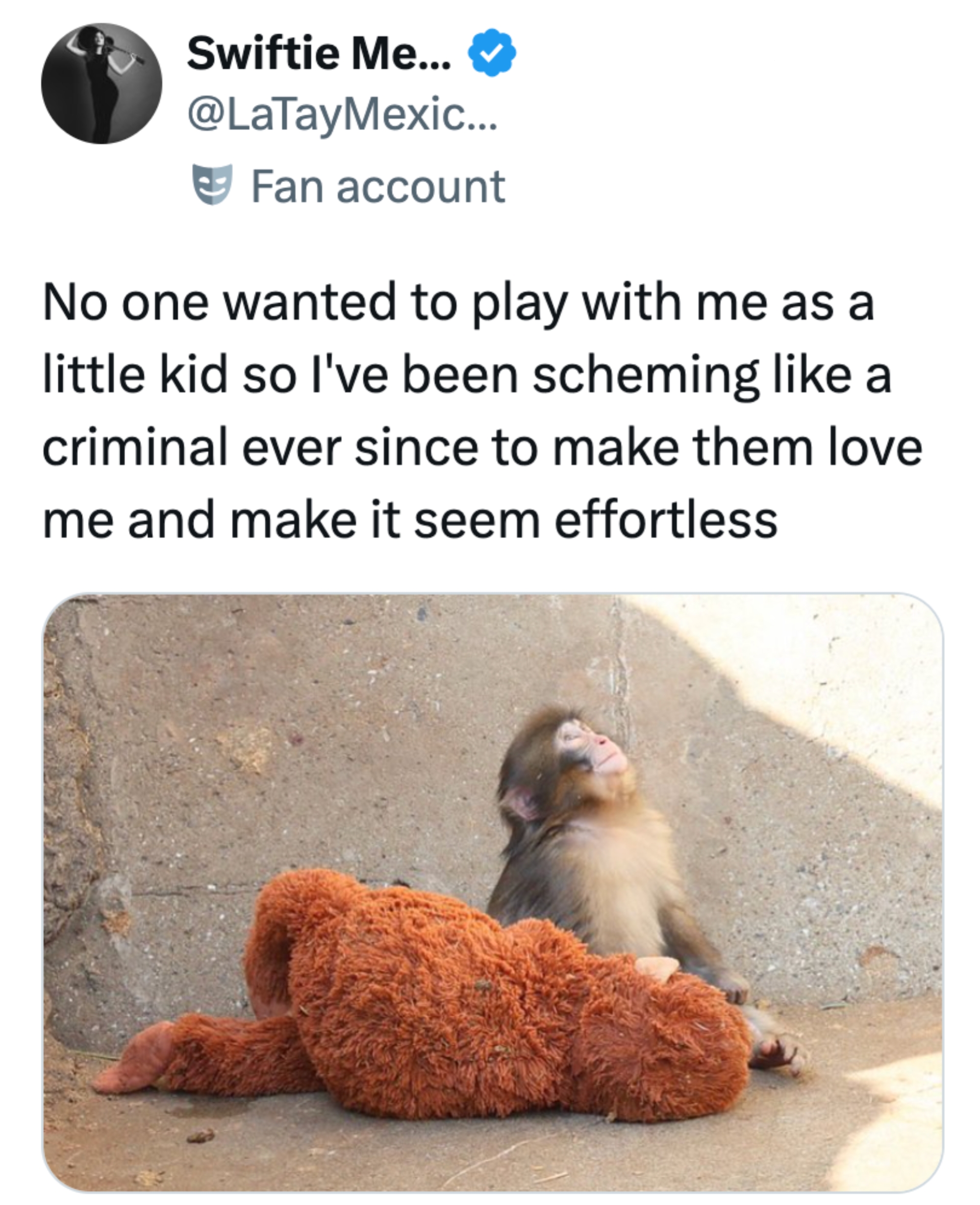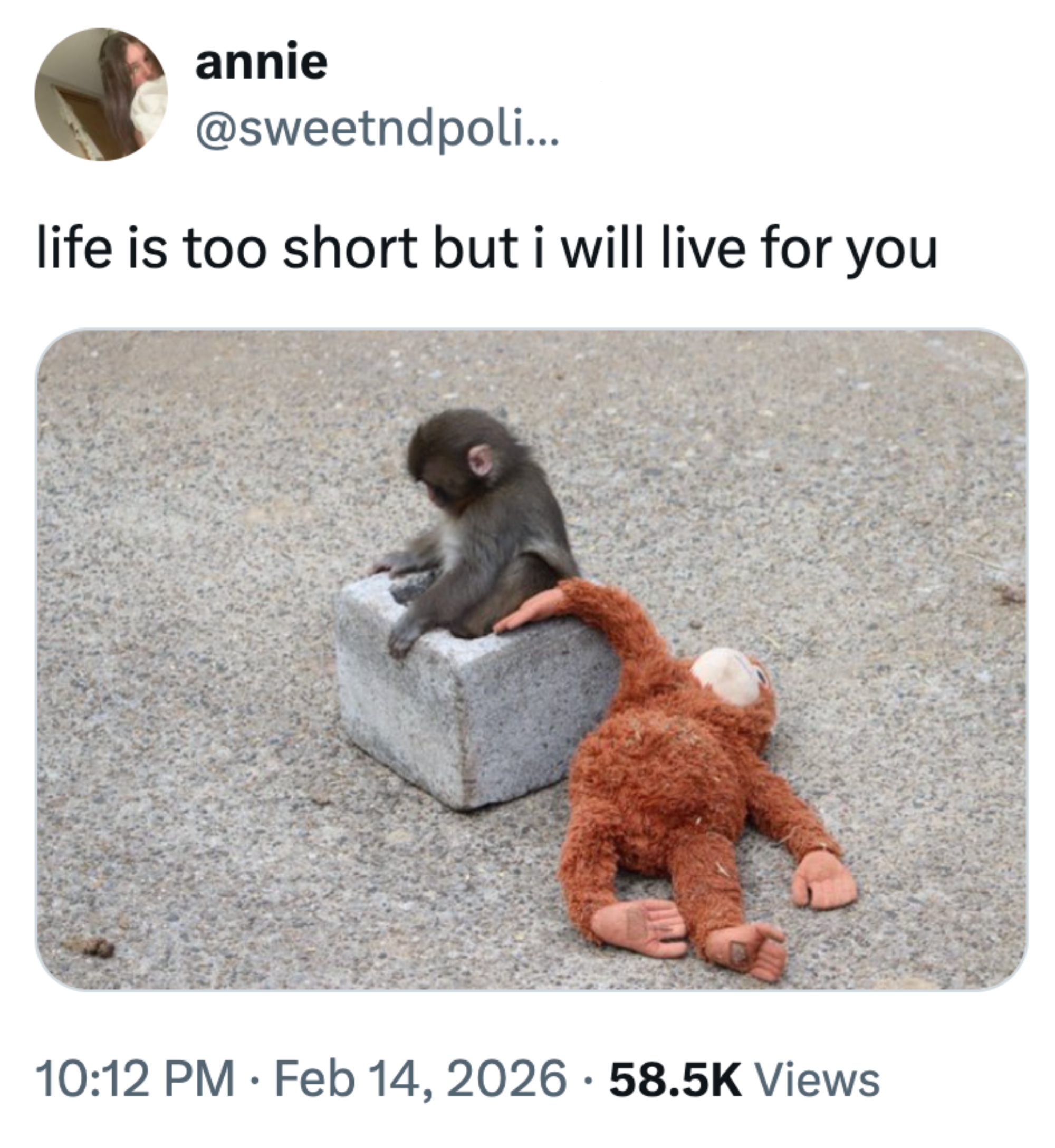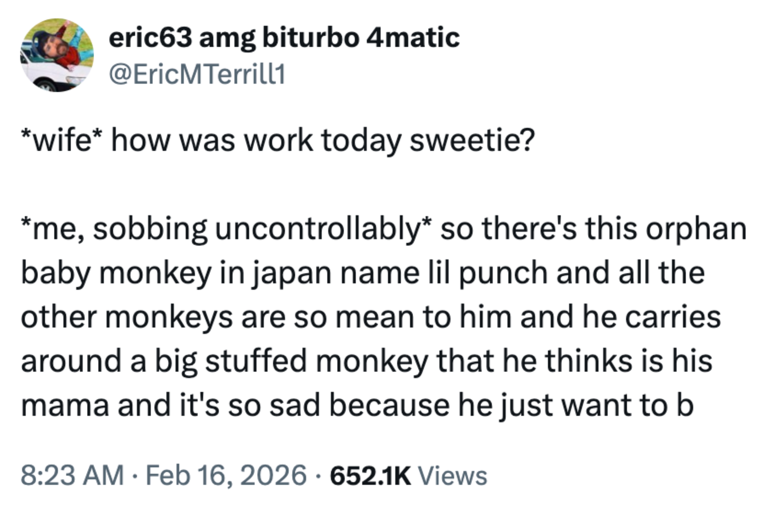 Punch carries his stuffed animal everywhere like a little tiny human.