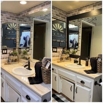 Promising review: "Where do I start? I absolutely LOVE this product. I wanted to replace our bathroom mirror, but due to the size, it would have cost a lot! I came across this on Amazon and decided to give it a try. The application process was super easy and applied without bubbles as long as you go slow and rub it down as you go. I kid you not. It looks like wood and feels like it, too! You can feel and see the 'wood grain.' It’s absolutely stunning and looks like I bought a whole new mirror." —Taylor