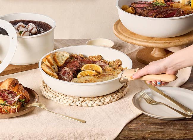 We hope you love our recommendations! While every product is independently chosen by our editors, BuzzFeed and our publishing partners may collect a share of sales or other compensation from the links on this page. You can read more about how our affiliate partnerships work in our Editorial Standards & Ethics Guide. Meet the new soon-to-be MVPs of your kitchen. This little bloodsucker is 100% food-safe, BPA-free, and dishwasher-safe! Promising review: "It's so ridiculous how cute and functional it is! I hated chopping or mincing garlic before getting this! It is fast and efficient and can get a lot done quickly. Did I mention how cute this is? Also, please know that this IS dishwasher-safe. I pop the hair off before putting the top in the dishwasher, and the bottom is one piece, so there are no issues with water getting in and staying there, as other reviewers have expressed concerns about. BUT! If there is ONE THING that is a bit of a pain, it is getting ALL the bits out — but a small silicone spatula or scraper does the trick just fine for me! I use this garlic tool daily; it is honestly a game-changer for my cooking game!" —Llamazon Customer Get it from Amazon for $14.95 (also available in three other designs). Promising review: “This oven is fantastic! We had the previous version of this oven without the air fryer and loved it for years! We used it for roasting, broiling, and baking. It did everything a full-size oven can do, without heating up the entire kitchen. But I was really interested in the air fryer. It did not disappoint! So far, I've only used it to crisp up a leftover dosa from lunch, but it did the job perfectly in under two minutes! I am looking forward to all the things I will be using it for. I have not made (or reheated) pizza yet, but I'm looking forward to that, too. Great purchase!” —Nikki G Get it from Sur La Table for $349.95 (available in five colors). Promising review: "Crock-Pot liners are a total time-saver! They make cleanup effortless — no more soaking or scrubbing stuck-on food. They hold up well during long cooking times and don’t affect the meal's taste. Perfect for busy days or large gatherings." —Jasmine Alexander Get a pack of 20 from Amazon for $12.08. Promising review: “Effective. I feel like very little pressure is needed to get a good zest. The shield is a nice touch for protection when storing in a drawer.” —Ezuble Promising review: “Outstanding performance! I use it every single day, and it continues to impress me like nothing else I’ve used. No matter what I toss in — fruits, veggies, nuts — it blends everything into a silky-smooth consistency. I especially love that I never have to bother with a strainer; the results are flawless every time. And the self-cleaning feature? Total game-changer. It saves me time and effort, making the whole experience even more enjoyable.” —Kindle Customer Get it from Amazon for $429.95 (available in four colors). Promising review: "This is an awesome, very versatile favorite skillet. I use it for many things. It's spacious enough to handle many ingredients for a nice-sized meal. Love the enameled finish!" —Richard W Get it from Sur La Table for $249.95 (originally $357; available in seven colors). The set includes an 8-inch chef's knife, an 8-inch slicing knife, a 7-inch Santoku knife, an 8-inch serrated bread knife, a 5-inch utility knife, a 3.5-inch paring knife, kitchen shears, and six blade guards. Promising review: "This kitchen knife set is excellent quality and a great value. The knives are sharp and feel comfortable in the hand, making food prep so much easier. The set covers all the essentials, and each knife feels sturdy and well-made. I also appreciate how sleek they look on the counter. Such a pretty color, too, and I love that they all have covers. Overall, a reliable, high-quality knife set that I’m really happy with and would definitely recommend." —Kimmi Get it from Amazon for $19.99+ (available in three colors and a multi-pack). This set includes an 8-inch fry pan, a 10-inch fry pan, a 2-quart saucepan, a 3-quart saucepan, a 4-quart sauté pan, an 8-inch silicone lid, a 10-inch silicone lid, a 7-inch fridge storage lid, an 8-inch fridge storage lid, two removable handles, four pan protectors, a spatula, and a spoon. Promising review: "Carote makes really great kitchenware. This is the second set of pots/pans I've ordered from them. They're super durable, cook evenly, and give us zero problems. They stack up and save space. I LOVE that they come with protective liners, so they're stored with care. This is just an all-around great cookware set that I can report I have zero faults with. The nonstick ability is 10/10 — I NEVER struggle to get them clean, it's always quick and easy. Carote's products are a most excellent value for the money — they're built to last and look great. The utensils are of high quality as well. Easy to clean, and they won't damage the pans." —Dani True Get it from Amazon for $56.98 (available in three colors and a 16- or 25-piece set). This set includes a 1.5-quart bowl, a 2.5-quart bowl, a 3.5-quart bowl, a 4.5-quart bowl, and a 5.5-quart bowl. Promising review: “Love these. Perfect sizes for what I need them for. They are pretty and keep up nicely. I run them through the dishwasher without any issues of warping. No staining so far.” —Latina Get it from Wayfair for $39.99 (originally $49.99; available in two colors). This set includes two 1.3-cup containers, two 3.2-cup containers, and one 9.6-cup container. Each container also comes with a corresponding lid. Promising review: “I’m really impressed with these Rubbermaid Brilliance containers. They seal tightly with zero leaks, even when carrying soups or sauces, and the lids snap on securely every time. The clear design makes it easy to see what’s inside, and they stack neatly in the fridge or lunch bag. They're super sturdy, dishwasher-safe, and still look brand-ne