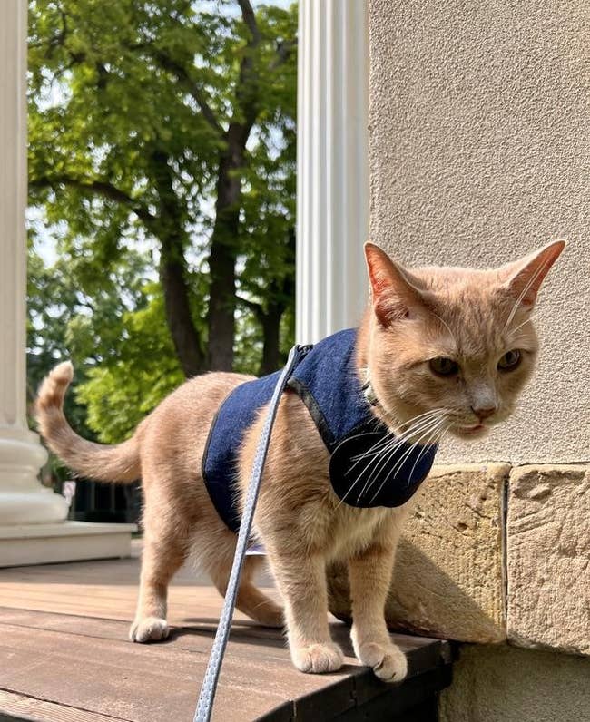 Promising review: "I'm flying with my cat for the first time and want to make sure that when I have to take him out of the carrier for TSA that he won't get away from me out of fear of all of the people and noise in the airport. This cat harness fits perfectly since the Velcro makes it completely adjustable, and it's lightweight, soft, and breathable fabric, so my cat won't be uncomfortable in it." —Lisa
