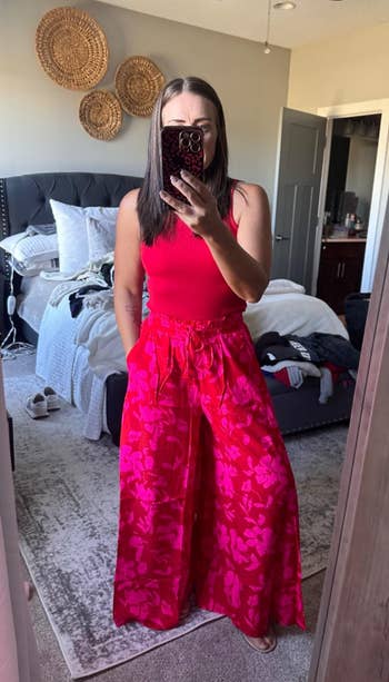 "I loved these pants — I got the red print with the pink floral pattern. I got so many complements and they were so comfortable! I wore them during a long day of traveling and navigating airports and they held up beautifully." —Amazon Customer
