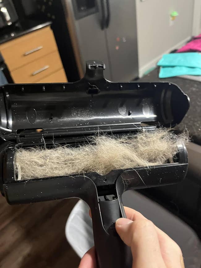 Promising review: "Look at the dog in this pic. LOOK AT HER! This isn't even my dog, man. My mom just had to pick the hairiest, oldest, clingiest American Eskimo dog, and then go and break her foot, so now who has to watch her?? You guessed it. ME. Phoebe sits at my feet under my desk all day. This is only like three days' worth of fur. I have used this Chom Chom thing on my carpets, my black couch, my clothes, you name it. It leaves those nice lines on the couch, too. I didn't even vacuum my rug first, and this is how well this thing works. I have tried a few things, but this pet hair remover is straight up magic. The before and after pics are about 10 seconds apart from each other, so yeah, I'd say you better go ahead and get this." —Danielle Torres