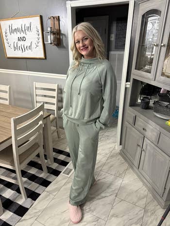Promising review: "Buttery soft is an understatement! This two-piece set is so unbelievably soft and comfortable! I honestly feel like I’m wearing a cloud!!! I’m 5’9 150 pounds, and I’m wearing medium. Could size down to a small, but I like the oversize look for comfort. It’s not super thick, which I love because I’m always hot! The color I have is sage green, and it’s perfect for fall and winter! I’m certain this outfit will last as long as I need it to! The material is fantastic! 1,000% recommend this item." —Dana Merida