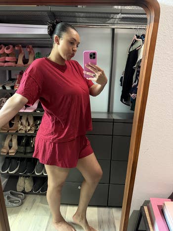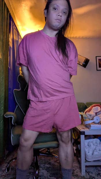 Promising review: "Love the fit and material! The color is vibrant and so pretty. It’s a softer knit material and thin but definitely not see-through! I’m 5’4”, 130 pounds, with an hourglass shape and got a size small. It fits oversize in the best way! The shorts are a bit long in the crotch, so I rolled the waistband to give them a shorter look — worked perfectly. Loved the set so much, I’ll definitely be buying more colors!" —Conrad