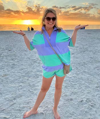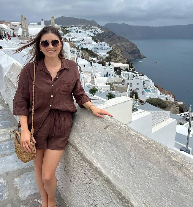 "I’m not usually someone who can buy clothing in sets because my top and bottom halves are wildly different sizes, especially with how different every style and size fits. So when I saw this, I was super skeptical, but I also really, really wanted to give it a try, and I AM SO GLAD I DID. It is comfortable, cute, and so versatile. I dressed it more casually for a day out in Europe, but I can’t wait to wear it with some wedged boots too for a more dressed-up look. The fabric is perfect for the fall transition as it’s not thin, but it’s also not super heavy. I’m 5’5” 170lbs for reference, and I got a large! I’m wondering if I could fit in a medium, though, as it was very oversize." —Lindsay P