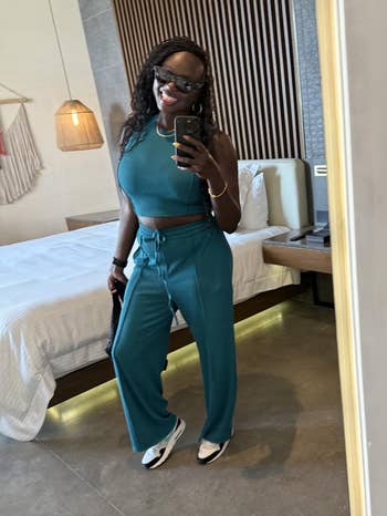 Promising review: "Cute set that is very comfy and perfect for travel. I wore it for 40+ hours and felt comfortable the whole time. Love the bright color and the soft material. The ribbed cotton style fabric looks nice and not cheap like some other fabric types can. The pants are long (I'm 5'2") but high-waisted enough that they can just be pulled up, and this also gives more coverage with the cropped top. Highly recommend, and I will get this in more colors. Do make sure you wash it by itself in cold water the first time, as the color does run at first. It's fine now." —Lucy Marie