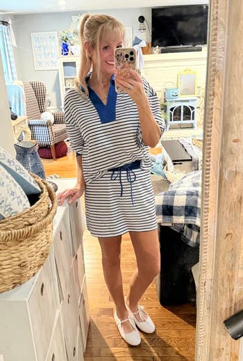 Promising review: "The two-piece set is very cute and comfortable. I wore it to my grandparents' birthday dinner and received many compliments. I wasn’t sure if it would be too long or too short, but it’s an even length. It might be longer on ladies who aren’t as curvy as I, with less booty, hips, and thighs. But overall, I think you’ll like it." —EmDeJai