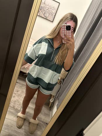Promising review: "I just recently received this set, and I'm kind of obsessed! I washed, dried, and wore it, and so far so good! It held up fine during the laundry cycle. The fabric is soft and comfortable, which really impressed me because I believe it's made of polyester (which I normally shy away from). The fit is a bit oversize, which I appreciate, and I think it's fairly complementary given the fact that I'm a thicker girl. I was hesitant to spend almost 50 bucks on a shorts set, but I'm glad I did, and I'm already thinking about getting another color!" —ItsJustMe