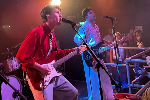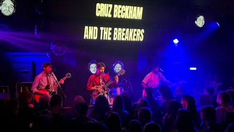 Cruz Beckham, the youngest son of David and Victoria, is trying to forge a path as the frontman in a rock band, and they started their first headline tour this week. What's more, they're not terrible. When Cruz Beckham and his band played their early gigs supporting Welsh indie group The Royston Club last year, they did so under a series of different names. He presumably didn't want their first steps to be in the full glare of the attention and judgement that comes with being a member of one of the world's most famous families. A nepo baby supreme. But as he hard launches his music career, the 21-year-old knows he can't escape his identity, so he might as well embrace it. At the first night of his first headline tour in Birmingham on Wednesday, it was literally up in lights above the stage throughout the show. Cruz isn't shying away from his family connections. "Nice T-shirt," he remarked to an audience member who was wearing a top with "POSH" in big letters with a photo of his mum in her Spice Girls pomp. But that only goes so far. When someone in the crowd shouted "Play the Spice Girls!", he responded with a swift riposte: "Sorry, I don't take requests." Nor did he make any mention of the elephant in the room - or any room the Beckhams set foot in - the recent family drama involving his estranged older brother Brooklyn. As with his mum, dad and other siblings, the strategy has been to keep calm and carry on, and Cruz is going about the business of music with an air of exuberance and fun. The tour kicked off at Mama Roux's club in front of a few hundred fans who were attracted as much by his ebullient indie music as their curiosity in the Beckham clan. Lucy Barrett, 17, saw Cruz supporting The Royston Club last year, but had no idea who he was until she got home. "He was so good," she says. "We really enjoyed it, but we when he first came on we didn't know who he was. Then I found out on TikTok afterwards when I was searching who the supports were." He makes "feel-good music" and can "definitely" make a career from it, she believes. Mum Toni Green, 54, adds: "You don't know whether the surname will help or hinder. "A few things we read on TikTok and Instagram said, 'I was actually surprised, I thought he wouldn't be very good, but it's music's actually all right'." "Obviously we know the parents and what they're about," another fan, Dylan Hexley, 23, says. "So we were interested to see what talent he's got and see if he can create his own path. "I didn't realise it would be so guitar heavy. Obviously his mum's a singer, and I thought he would just be a frontman. It seems he's got this little 60s twang, so I suppose he's trying to break away from that pop culture that his mum created in the 90s." Victoria Tamlyn, in her "mid-50s", was introduced to Cruz's music on YouTube. "It's really good. But I'm a big Beckham fan anyway," she laughs. "He's finding his own way, isn't he? It's not like it's just because of his mum and dad. He's doing his own thing, which is lovely. And he's he seems quite good at it, so it's good to support him." It's not surprising that David and Victoria's children should follow them into the limelight, and Cruz got a taste for performing at a young age. When he stole the show with the Spice Girls by showing off his breakdancing skills just before his third birthday, his mum declared him to be "the next Justin Timberlake". Cruz himself has a different role model. "I want to be John Lennon," he sings in one of his songs. "That was one about my idol," he told the Birmingham crowd. "And this is one he wrote," he said, launching into a cover of The Beatles' 1968 classic Revolution. Cruz loves the Fab Four so much that, days before the tour began, he celebrated his 21st birthday with a party dubbed The Grand Beatle Ball, at which he joined tribute band The Bootleg Beatles on stage. His own sound is heavily indebted to both 1960s rock 'n' roll and 1990s Britpop, and he has described his band's new single For Your Love as "a modern take on a vintage sound". While not a cover of The Yardbirds' 1965 single of the same name, it aims for similar territory. As a live performer, Cruz has enough charisma and energy to make it, as do his slick and dynamic band. It was a good gig, exceeding my (admittedly low) expectations. And Cruz will probably be happy with ticket sales. Eight of his remaining 10 UK dates are sold out. But his music ultimately falls short of the legends he's trying to replicate. Rather than being the new John Lennon, or even Justin Timberlake, Cruz's reedy voice and upbeat retro psych pop could make him the new Crispian Mills - another nepo-rocker (the son of actress Hayley Mills and grandson of actor Sir John), whose band Kula Shaker made it moderately big in the afterglow of Britpop. The three songs Cruz has released so far have elements of familiar musical heroes and show some promise, says Ruchira Sharma, co-host of pop culture podcast Everything is Content. "It harks back - it feels a bit Liam Gallagher-esque. "It's not bad, but I also think there's a reason why it's not necessarily blowing up in a massive way, because I don't necessarily think it's original," she says. "There's some nostalgia there, so I think it probably is coming out at the right time, because we are really calling back to nostalgia from 90s and 00s rock music." Cruz seems to have a clearer idea of his future path than his siblings, at least. Romeo, 23, tried to follow his father into football and modelling, while Brooklyn, 26, has had stabs at careers in photography and cooking. "Obviously there's been so much about Brooklyn having tried all these different careers, and none of them really sticking," Sharma says. The Beckham bandwagon gives Cruz many advantages, of course. The number of guitars he played on stage on Wednesday would be beyond the reach of the average new artist, for a start. He's been signed by Republic Records, the home of Taylor Swift, The Weeknd and Ariana Grande. In t