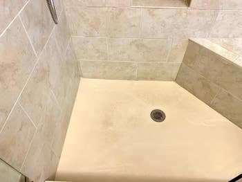 Promising review: "I have well water. Something in my well water reacts with copper plumbing and turns my shower tiles blue. Since my bathroom color scheme isn't on the blue spectrum, this is problematic. The well water also causes the shower glass to film up quickly. I've tried dozens and dozens of cleaners and scrubbed ’til my arms ached, trying to get ahead of the blue and scumminess. My ambition in life is NOT to be a full-time bathroom scrubber! I saw this stuff on a professional house cleaner's TikTok (sorry, I don't remember which one) and thought, 'What the heck, might as well give it a try.' Oh my goodness, the first day after my shower, I sprayed this stuff all over and walked away. The next morning, there was a NOTICEABLE reduction in the blue, and the glass looked clearer, too. On day two, I sprayed again and walked away. The next morning, the blue was gone except for a few spots on the floor tile, and the glass looked amazing. On day three, I sprayed the remaining spots, and the next morning, the shower practically looked new. NO SCRUBBING AT ALL!!!! This is my new favorite shower cleaner. The ONLY con I have is that it makes me sneeze while spraying from inside the shower, but I can live with that." —L. J. Petillo