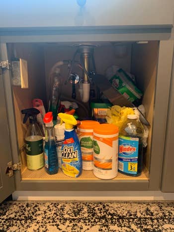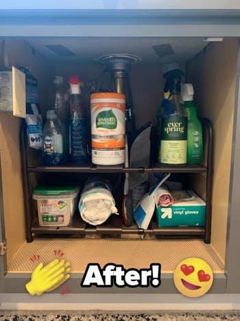 Promising review: "The cabinets under my bathroom sinks were completely unorganized, and it made it difficult to find things in a pinch. I looked into other shelves, but they were made of flimsy plastic and would not fit, due to the pipes coming out of the sinks. I am SO happy that I found these shelves, as they are made of durable metal, hold a lot of weight, and are completely adjustable to fit the space that you need. The shelf plates are able to be moved around to compensate for the pipes coming out of the sinks, and the length of the unit can be adjusted as well. Now, my bathroom cabinets are organized, and I have added a lot of extra space under my sinks. I highly recommend these shelves to anyone looking to organize cramped spaces!" —Lionpride505