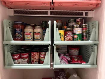 "Most organized my hallway closet has ever been in 35 years. The green trays are sturdy and stack nicely on top of each other. Lightweight. I put heavier items in the bottom trays. And lighter items in the upper trays, so they slide easy and maintain their balance when sliding them back or forwards, depending on which tray you're getting your items out of. And a nice size and good deal for the price." —Placeholder