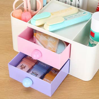 Promising review: "Cute, practical, useful, convenient. It's only $9, so just get it. It's small but not too small to fit all of your essential bathroom stuff. It sits in the corner of my sink perfectly. I love the little drawers; they fit more stuff than you'd think. It works great and looks great in the bathroom and in the office." —Joey