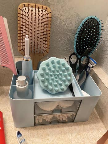 Promising review: "Ordered this to help free up drawer space in my small bathroom and it has saved so much space so far. And it doesn't look cluttered on the countertop, and the grey matches with my bathroom color. My other family member got the green one and is also very beautiful." —Mackenzie