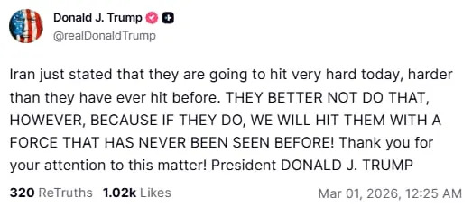 President Donald Trump issued a warning to Iran just after midnight as tensions in the Middle East threaten to spiral. “Iran just stated that they are going to hit very hard today, harder than they have ever hit before,” Trump wrote on Truth Social. “THEY BETTER NOT DO THAT, HOWEVER, BECAUSE IF THEY DO, WE WILL HIT THEM WITH A FORCE THAT HAS NEVER BEEN SEEN BEFORE!” The post, signed off “President DONALD J. TRUMP,” marked his most explicit threat yet of overwhelming retaliation. It came hours after Tehran signaled it would intensify its response to ongoing U.S. and Israeli strikes, raising fears of a rapid and dangerous escalation. Mohammad Bagher Ghalibaf, speaker of Iran’s parliament, lashed out Sunday, calling U.S. and Israeli leaders “filthy criminals” and vowing they would suffer “devastating blows” for crossing Iran’s “red line.” In a televised address, he warned: “You have crossed our red line and must pay the price.” In a statement posted to its official Telegram channel, Iran’s Revolutionary Guards vowed to launch the “most ferocious offensive operation in the history of the Islamic Republic of Iran’s armed forces” against Israel and U.S. bases, saying the operation would begin “any moment now.”