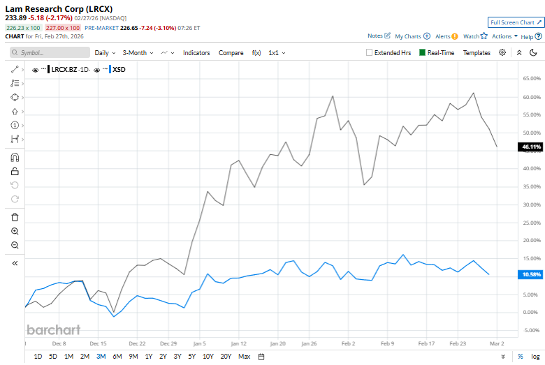 This tech giant is currently trading 8.9% below its 52-week high of $256.68, recorded recently on Feb. 25. Shares of LRCX have rallied 50.8% over the past three months, considerably outpacing the State Street SPDR S&P Semiconductor ETF (XSD), which has gained 11.1% in the same time frame.