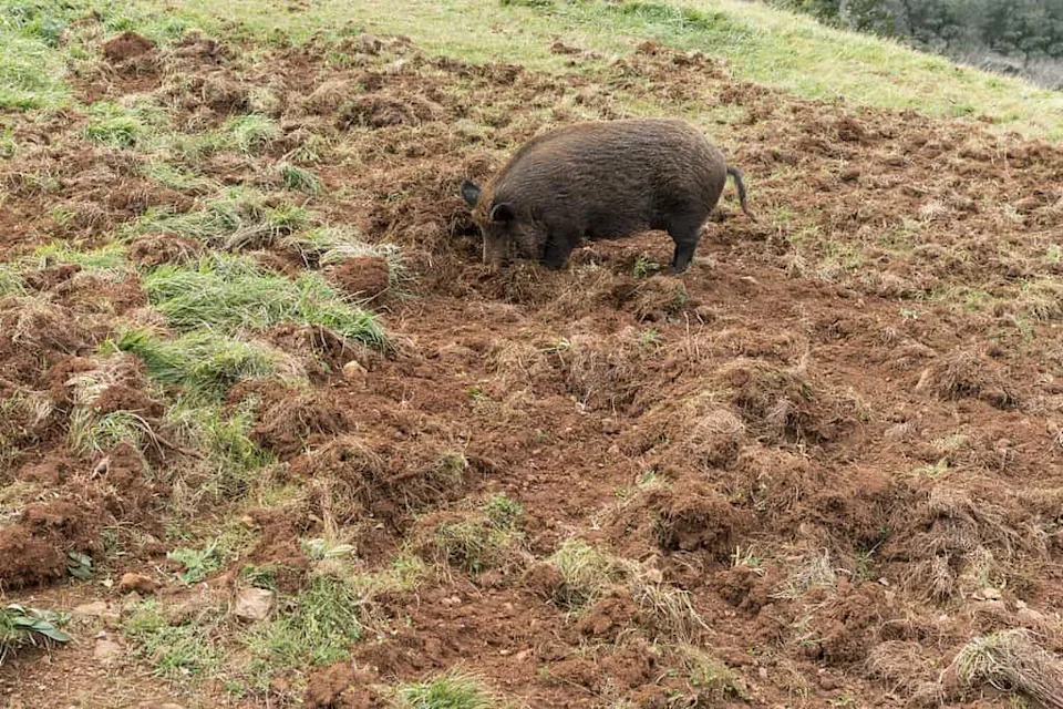 Feral swine can root up to three feet deep in search of food.