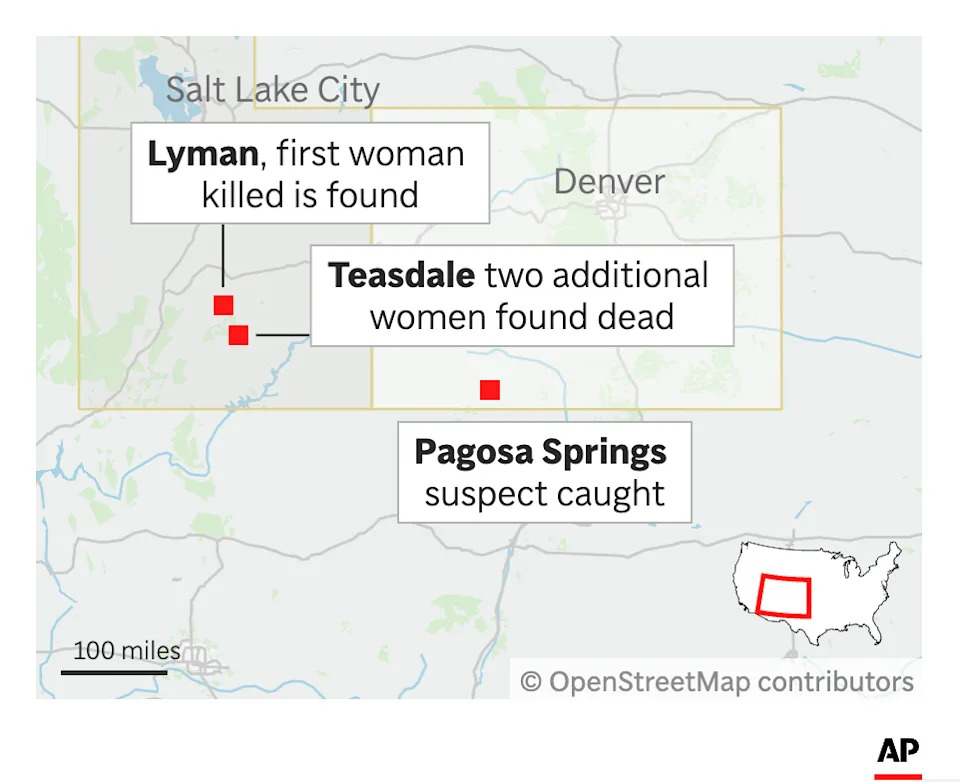 TORREY, Utah (AP) — Two men whose wives did not return from a hike in Utah's south-central desert arrived at the trailhead Wednesday to find both women dead and a car missing, spurring a multi-state search that led investigators to a third body before they arrested a suspect Thursday in Colorado. An Iowa man has been charged with aggravated murder in the deaths of the two hikers and a third woman authorities say he killed inside her home after he spent a night in a shed on her property. There was no indication that the man had any connection to the victims, said Lt. Cameron Roden of the Utah Department of Public Safety. Ivan Miller, 22, told investigators after his arrest that he killed the three women to steal their cars and credit cards because he needed money to get back to Iowa, charging documents show. He had hit an elk a few days earlier in a tiny Utah farming town near Capitol Reef National Park and was without a vehicle after selling his truck to the tow company. After staying in hotels for a few days, Miller slept in the woman's shed. He stole her Buick after shooting her from behind while she was watching TV, Wayne County prosecutors allege. Miller, of Blakesburg, Iowa, told authorities that he quickly realized he did not like the Buick and wanted a different vehicle, according to court documents. He parked it at a trailhead about 10 miles (16 kilometers) from the first victim's home, saw two women get out of a Subaru and killed them before taking the car, the documents state. He attempted to conceal their bodies in a dry creek bed, prosecutors allege. The husbands called 911 and waved down a ranger after finding their wives shot and stabbed at the trail, which is used mostly by locals and partially shielded from the road by piñon and juniper trees, according to officials and court documents. Officials identified the hikers as aunt and niece Linda Dewey, 65, and Natalie Graves, 34, and the woman killed in her home as Margaret Oldroyd, 86. The hikers had no known connection to Oldroyd. Authorities found Oldroyd's body in a cellar under a shed on her property after identifying the owner of the stolen Buick left at the trailhead, according to court documents. Police used yellow tape to cordon off the brick home in Lyman and an outbuilding while investigators gathered evidence Thursday. Oldroyd's next-door neighbor of 20 years, Randy Jones, described her as “the sweetest woman you’d ever meet” and said he was shocked by her death. Oldroyd had a love of yard work, always keeping her flowers and lawn watered and neatly manicured. She used to work at a local grocery store stocking shelves, Jones said. And when Jones helped rid her yard of skunks, she’d bring him a cake as a thank you. “Out here in rural counties, we all take care of each other," Jones said. In recent years, he didn't see his neighbor leave home much except to attend religious services and pick up groceries. But every now and then, she would come over to Jones’ house, sit with him and visit his horses. Investigators have not found a motive for the killings and do not believe the suspect targeted the women for any reason other than “convenience,” Roden said. Investigators were still looking into when Miller arrived in Utah and what he was doing prior to the killings. Authorities used license plate readers and vehicle tracking services to follow Miller's path, from Utah through northern Arizona and into the mountain town of Pagosa Springs in southwestern Colorado, where he abandoned the stolen vehicle, Roden said. He was found after a short search. According to online jail records, Miller was being held on suspicion of carrying a concealed weapon, a misdemeanor. He was arrested in Colorado with a large knife and a .45 caliber pistol, according to court documents, and was scheduled to make his first court appearance in the state Friday afternoon. Miller is being represented at the hearing by the Colorado Public Defender’s office, said Justin Bogan, who heads the office in the judicial district that covers Pagosa Springs. Bogan declined to comment further. Voicemail messages left at listings for possible relatives of Miller were not immediately returned on Thursday. Authorities were working to bring Miller to Utah to face the murder charges. The Associated Press left a message for the public defender's office in Utah late Thursday afternoon. Before a suspect was in custody, Wayne County residents were asked to remain vigilant and schools were closed Thursday. Officials asked for help finding a white Subaru Outback but warned people not to approach it. ___ Slevin reported from Denver, Schoenbaum from Salt Lake City and Brumfield from Cockeysville, Maryland.