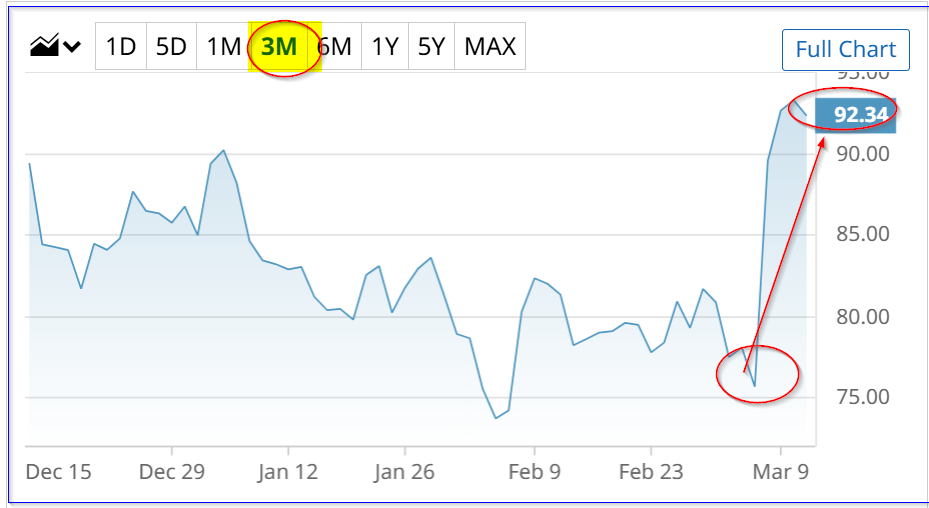 MRVL is at $91.05 today, down from a recent peak, but up sharply after its after-market close earnings release on March 5. On that day, MRVL closed at $75.68, so it's still up +20% in the last week.