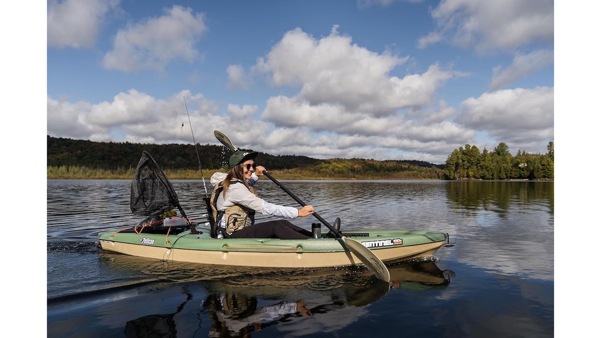 The Pelican Sentinel 9.6-foot kayak is lightweight and easy to transport. An adjustable backrest and molded footrests add comfort and stability, while a removable storage compartment keeps gear secure and dry.
