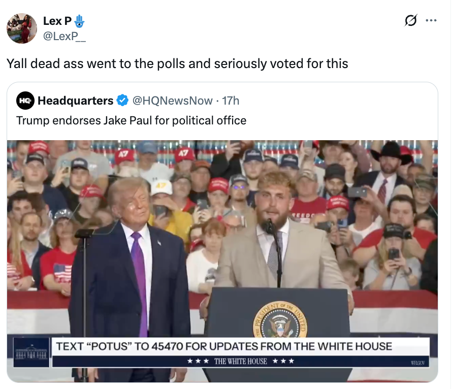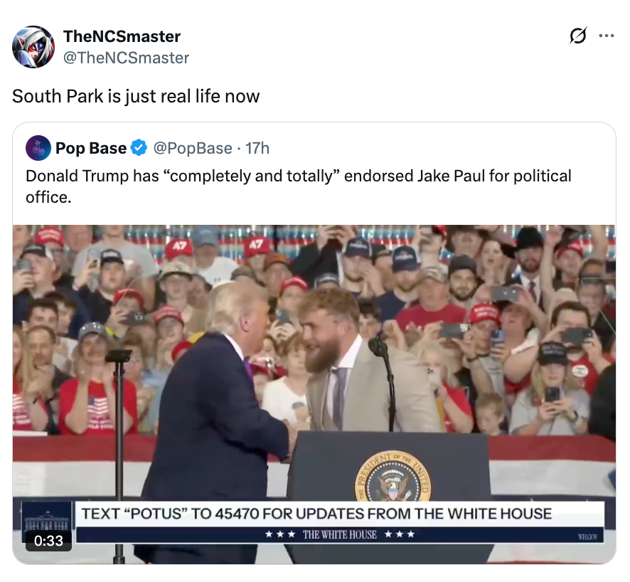 Trump endorses Jake Paul for political office pic.twitter.com/0HGHMccX4l