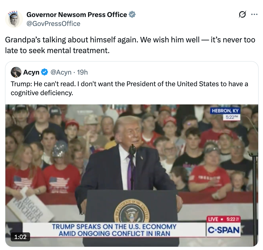 He got straight to the point with this one. Trump: Newsom had admitted he has mental problems, that he's not a smart person, that he’s unable to read a speech. He can't read. I don't want the president of the United States to have a cognitive deficiency. pic.twitter.com/TadARABxPX