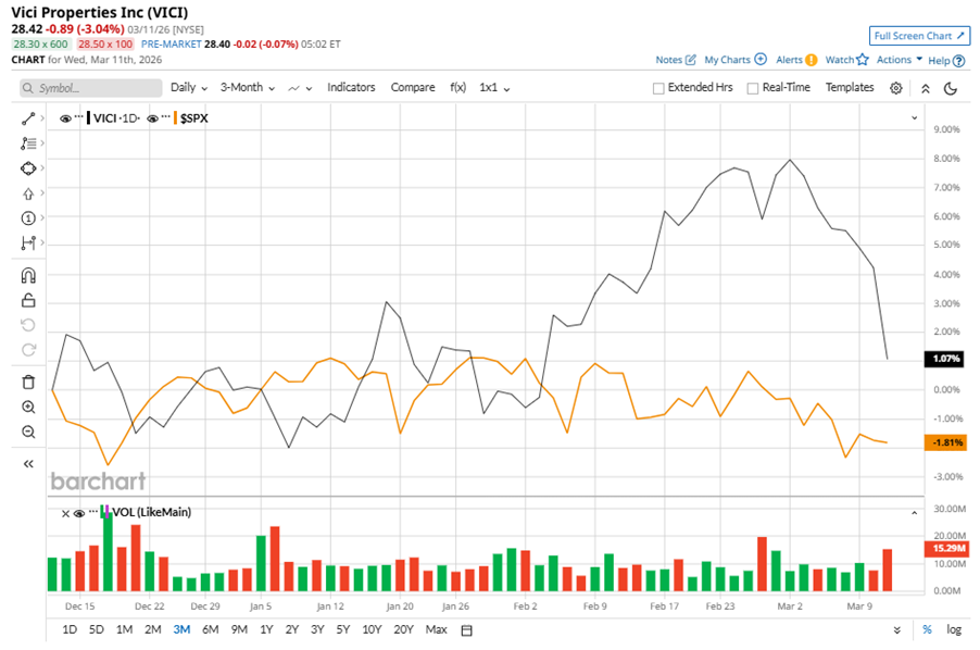 VICI Properties Inc. (VICI) is an experiential real estate investment trust that owns one of the largest portfolios of market-leading gaming, hospitality and entertainment destinations, including Caesars Palace Las Vegas, MGM Grand and the Venetian Resort Las Vegas, three of the most iconic entertainment facilities on the Las Vegas Strip. The company is valued at $31.3 billion by market cap. Companies worth $10 billion or more are generally described as “large-cap stocks,” and VICI perfectly fits that description, with its market cap exceeding this mark, underscoring its size, influence, and dominance within the REIT - diversified industry. VICI's strengths include its portfolio of 54 gaming properties and 39 experiential assets, including iconic venues like Caesars Palace. Its long-term triple net leases provide stable, low-risk revenue. How to Create a 24% Synthetic Dividend on Intel (INTC) Stock Using Options Silver Is Going to Make Traders A Lot of Money: 2 Ways to Play It S&P Futures Waver as Middle East Conflict Uncertainty Persists, U.S. Inflation Data in Focus Tired of missing midday reversals? The FREE Barchart Brief newsletter keeps you in the know. Sign up now! Despite its notable strength, VICI slipped 16.4% from its 52-week high of $34.01, achieved on Aug. 5, 2025. Over the past three months, VICI stock gained 1.1%, outperforming the S&P 500 Index’s ($SPX) 1.8% decline during the same time frame. Shares of VICI rose 1.1% on a YTD basis, outperforming SPX’s YTD 1% loss. However, in the longer term, the stock dipped 12.2% over the past 52 weeks, underperforming SPX’s 21.6% returns over the last year. To confirm the bearish trend, VICI is trading below its 50-day moving average recently. The stock has been trading below its 200-day moving average since early October, 2025. On Feb. 25, VICI shares closed down marginally after reporting its Q4 results. Its revenues increased 3.8% year over year to $1 billion. The company’s AFFO per share grew 5.6% year over year to $0.60. In the competitive arena of REIT - diversified, W. P. Carey Inc. (WPC) has taken the lead over VICI, showing resilience with an 11.1% uptick on a YTD basis and 13.5% gains over the past 52 weeks. Wall Street analysts are reasonably bullish on VICI’s prospects. The stock has a consensus “Moderate Buy” rating from the 23 analysts covering it, and the mean price target of $34.71 suggests a potential upside of 22.1% from current price levels. On the date of publication, Neha Panjwani did not have (either directly or indirectly) positions in any of the securities mentioned in this article. All information and data in this article is solely for informational purposes. This article was originally published on Barchart.com