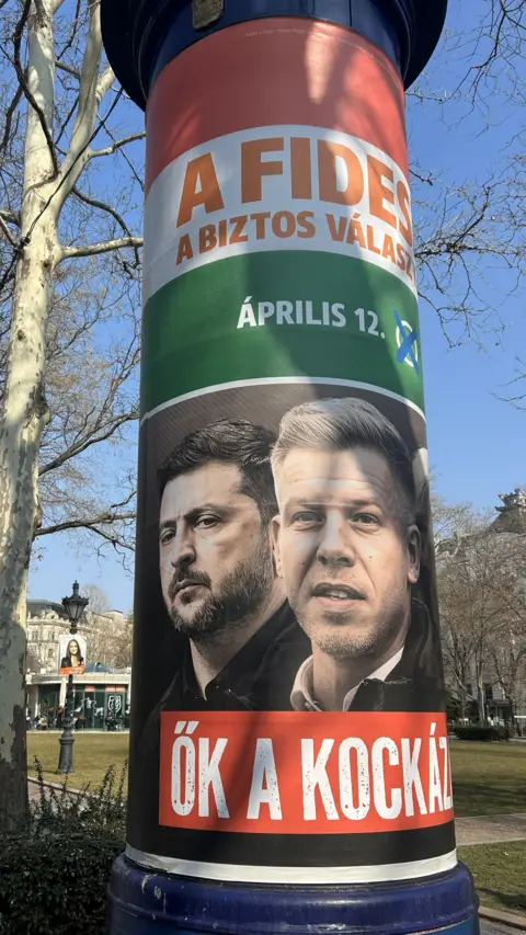 War-torn Ukraine "will stop at nothing" to prevent Prime Minister Viktor Orbán and his Fidesz party winning the upcoming Hungarian elections, the Hungarian government claims. Physical violence against the prime minister and his family, and attacks or sabotage of key energy installations, are being prepared, ministers allege. The Ukrainian government, in turn, accuses its Hungarian counterpart of whipping up a hate campaign against it to frighten Hungarians into voting Fidesz back into office. A third party is in the middle: Russia. The Financial Times reported on Wednesday morning that the Social Design Agency, a Kremlin-linked media consultancy firm, was preparing a mass disinformation campaign in Hungary, to bolster Orbán and discredit the opposition Tisza Party and its leader, Peter Magyar. With just 30 days to go until the parliamentary election in Hungary, some analysts believe the anti-Ukraine hysteria proves that Orbán is panicking in the face of probable defeat. His Fidesz party trails to Tisza by 39% to 50% in the latest poll. Others say Orbán knows his electorate well - and that if they can be convinced that the country is in mortal danger, he could win a remarkable fifth consecutive victory on 12 April. At the core of the dispute is the disruption of the Druzhba (Friendship) pipeline on which Hungarian and Hungarian-run Slovak refineries depend. Oil deliveries through the pipeline stopped on 27 January, after a Russian drone strike caused a fire at the Brody oil hub in western Ukraine. No oil has arrived in Hungary since then. Last week, Orbán produced satellite images which, according to him, show that the pipeline is intact. He and his ministers accuse Ukraine of delaying repairs, in order to harm Orban's re-election chances, by causing a fuel shortage in Hungary. "The Orbán government is not telling the full truth," András Rácz a security analyst, at the German Council on Foreign Relations, told the BBC, regarding Hungarian government claims that no technical obstacles remain to restarting the flow of Russian oil to Hungary. In the 27 January Russian attack, Rácz said, an oil tank containing 75 million litres of crude oil at Brody was damaged, and to save the oil and prevent an environmental disaster, it was pumped into the pipeline for storage. The presence of that oil, and other technical damage resulting from the first and a subsequent Russian attack, prevent the restoration of supply. Ukraine says it could take six weeks to repair. The Ukraine hysteria in Hungary takes many forms. Giant billboards and city lights posters cover the country. Some show Ukrainian President Volodymyr Zelensky begging for money from EU chiefs. Others juxtapose Zelensky and Peter Magyar. His Tisza is accused of planning to get Hungary involved in the Ukraine war, by joining what is dubbed "the pro-war lobby" in Brussels - something Magyar vehemently denies. "We are the real party of peace," Magyar tells crowds at his daily rallies across the country. Orbán and his ministers tour the country, too, addressing what they bill as "anti-war" assemblies of Fidesz supporters. The most shocking video - an artificial intelligence production by Fidesz - shows a little girl asking her weeping mother when her dad will come home. This cuts to a firing squad where her blindfolded father is about to be executed. This will happen to Hungarians, the video suggests, if they vote for Tisza. Facebook has rejected readers' complaints that the advert violates its rules on both political and violence grounds. In a highly unusual move in peacetime, the army has been deployed to patrol key energy installations - "to reassure' the public" in the Fidesz narrative or "to frighten" them in the Tisza one. In the eastern city of Debrecen, Defence Minister Kristof Szalay-Bobrovniczky warned that the city could be a target for "hybrid operations" such as sabotage. The dominant pro-government media act as an echo-chamber for the government message. "Many people contact us, asking why, if the danger of attack is real, the government does not provide information about air-raid shelters," Tamas Polgar Toth, a journalist at the independent Debreciner news portal told the BBC. The Fidesz mayor of Debrecen, Laszlo Papp, later told the portal that this was being considered. On 21 February, Orbán vetoed the delivery of the EU loan, until the oil flow through the Druzhba pipeline was restored. Ukraine has resorted to a €1.5bn loan from the International Monetary Fund to tide it over until the dispute is settled. But on 4 March, Zelensky appeared to exacerbate the stand-off. "We hope that no-one in the European Union will block the €90bn (£78bn) [of EU aid, currently vetoed by Hungary]. Otherwise we will give that person's address to our armed forces so they can call on him and speak to him in their own language," Zelensky said. He did not name Orbán. The Hungarian prime minister was not pleased. "They want to get rid of us, with threats if possible, because if nice words don't work, then with threats and blackmail," Orbán told state radio on 6 March. A day earlier two vehicles of the Ukrainian state savings Oschadbank were seized crossing Hungary. The TEK anti-terror troops used in the operation were depicted on the front cover of the independent HVG weekly on Wednesday as Viktor Orbán's "private army" moving gold bars around the symbol of the Tisza party. Pro-government media allege that one of the lawyers at the company representing the Ukrainian bank as it tries to get back its money and vehicles is an ardent Tisza supporter. A decree issued by the government on Monday ordered prosecutors to investigate "whether Hungarian criminal organisations, terrorist organisations or political organisations present in Hungary may have benefited from the transported assets". On Wednesday, several members of a so-called fact-finding mission set up by the Hungarian government entered Ukraine by car. Their aim was to report on the