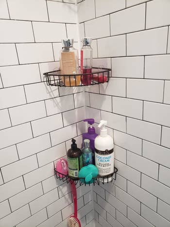 Promising review: "Perfect for my tile shower that had no shelving. I am able to fit a lot on the shelves with no hassle or worry that they might fall. I'd suggest to hook in the baskets first to the adhesive and then removing the back of the adhesive and sticking it onto the tile with the basket, so it applies evenly." —Amazon Customer