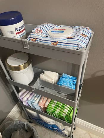 The four-tier cupboard slides around on four wheels so you can easily pull it out and push it back in.