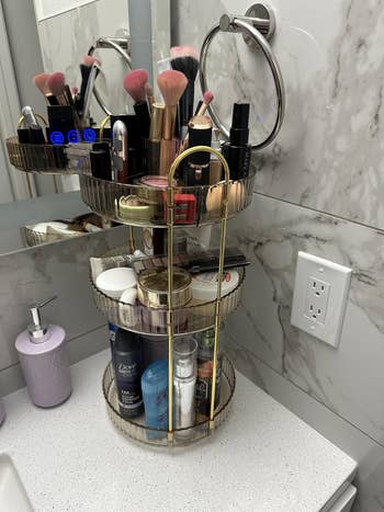 Promising review: "This tiered stand gave me back my bathroom counter space! I feel so organized and have a lot of counter space now. Easy to put together and very sturdy. Much more elegant than the plastic bin I had everything tossed in. Contemplating buying a second one because I like it so much!" —Avid Shopper