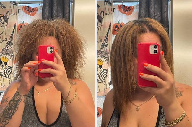 Here’s what BuzzFeed Shopping editor Jenae Sitzes has to say: "As someone who's never had the patience to blow dry their hair, I picked this air dry cream up after seeing its heat-free results in this TikTok and reading all the positive reviews. For context, I have extremely thin, fine hair that is mostly pretty straight. This air-dry cream has a really nice, silky consistency and smells like the salon (IDK how else to describe it, but it's a pleasant smell), and it doesn't make my hair feel greasy or crunchy after I've worked this through it. It definitely helps cut down on frizz and makes my hair feel really silky and nourished, even into the next day. If you don't have any natural wave to your hair, this isn't going to create that (at least not in my experience), so it makes sense that it's recommended for the hair types mentioned above. But even if you have straight, fine hair, if you don't already have a good leave-in conditioner, I'd still recommend this cream for its smoothing, hydrating benefits. A little goes a long way, and the bottle has a lot of product in it!"