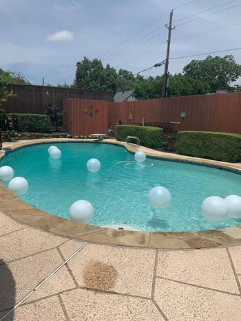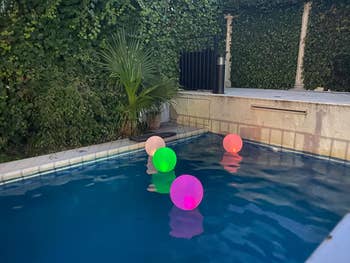 Promising review: "My pool is so old school and boring that I bought these to liven it up, and what a difference!! My pool went from 'meh' to WOW! The balls are easily inflated by mouth like a beach ball. Once inflated and a few hours in the sun, they are charged and ready to go. They light up after dusk (it has to be rather dark). There is no manual way to power them on or off; they glow all night long. The changing colors are vibrant and very beautiful. They have a loop at the top if you would like to hang them. They would be magical, hanging in a tree or from a pergola. I really liked how easy these were to fill and charge, and I like the solar power and the amazing color display. They make my inner child happy." —J. Matheson