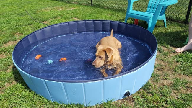 Promising review: "I am now the proud owner of THREE of these dog pools. I have an XXL, an XL, and an S pool for our backyard 'frogs' that wouldn't stay out of the big pools! Yes, I bought the frogs their own pool...that's how amazing these pools are! We had the XXL and XL pools out every day last summer (changed the water twice per week), and they were used daily by all three dogs. There have been no punctures of any sort or any issues at all with these pools, and my dogs can play pretty rough at times. The XXL pool was used for both the 2018 and 2019 summers with no issues. These pools are literally my dogs' favorite part of summer... I can't keep them out of them! As soon as we get back from a walk, they jump right in!" —Kate M