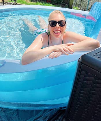 Promising review: "This is exactly what I was looking for. I agonized over which blowup pool to get because I didn’t want to spend money on something crappy that was just going to pop or not be comfortable. The price of this is SO low compared to the value. It’s much deeper and bigger than I expected. I’m 5'8" and can very comfortably extend all the way across and float without hitting the sides. The seat is so comfortable, and I’m really glad we got a pool with a seat. The seat alone can fit three people easily. We had six adults in the pool the other day, and it did not feel crowded at all. We blew it up with an air mattress pump and got a cover for it. I’m pregnant and wanted somewhere to cool down and float comfortably during the summer. This will also be a great pool for kids! Extremely happy we went with this one. Highly recommend." —Morgan Barry