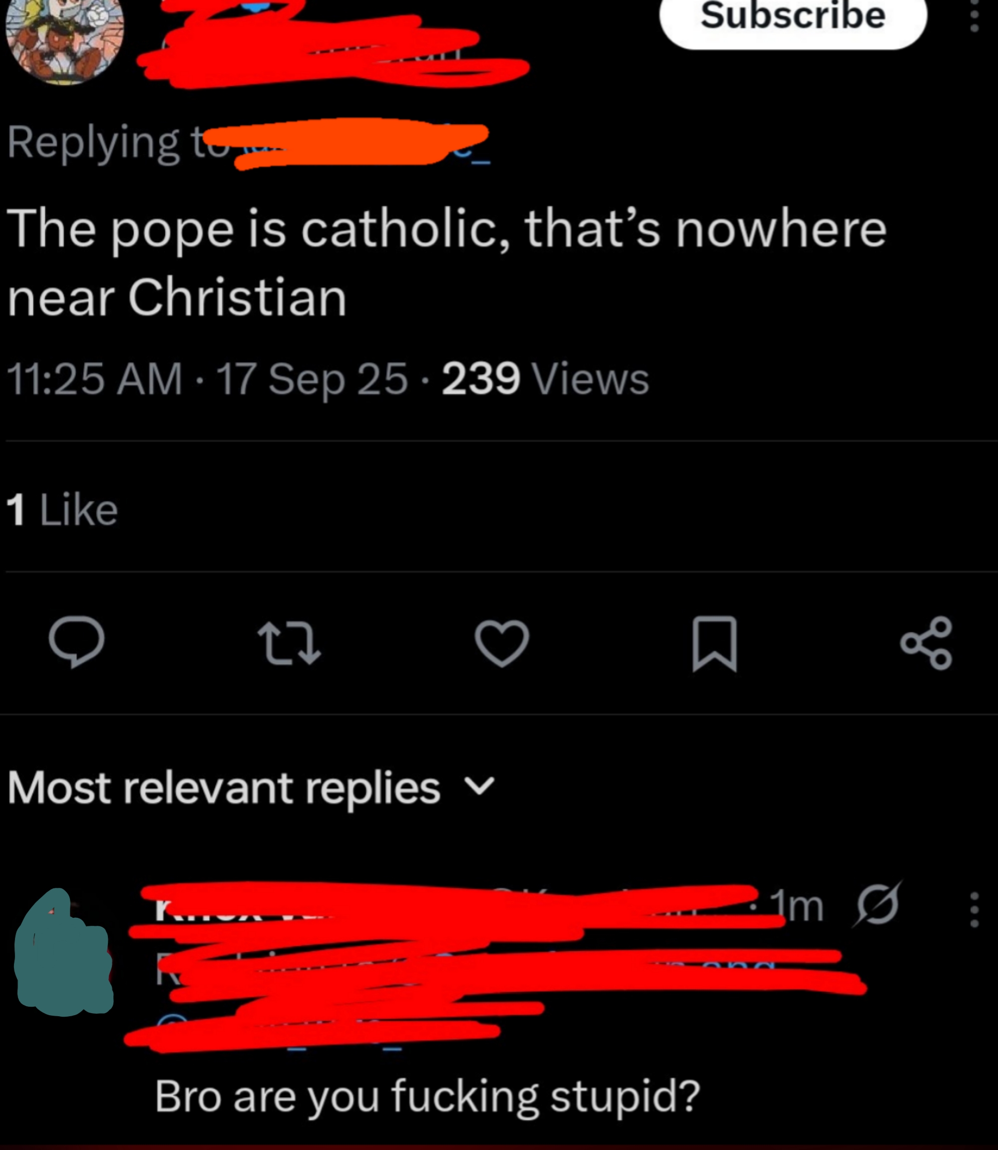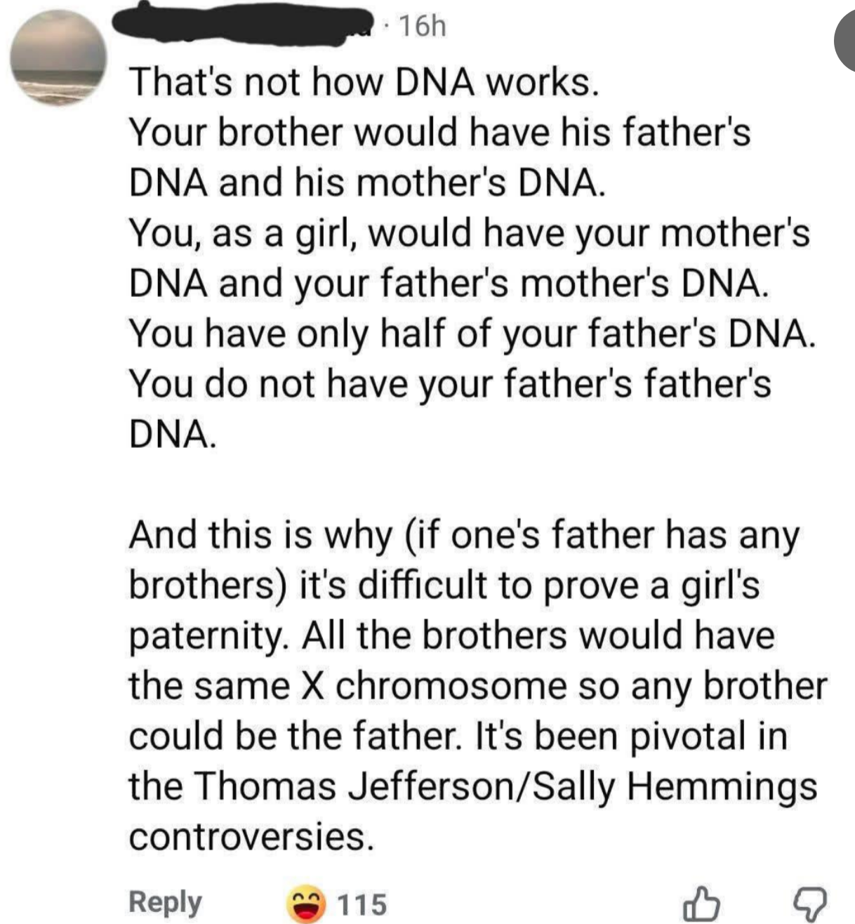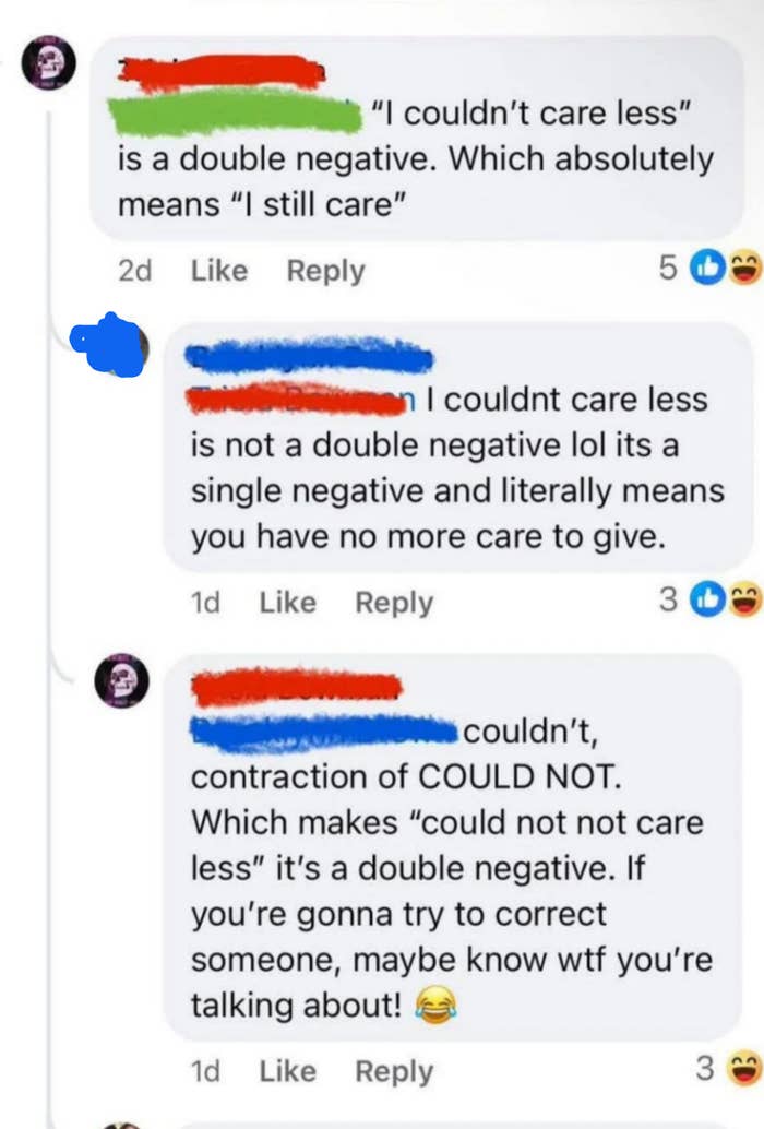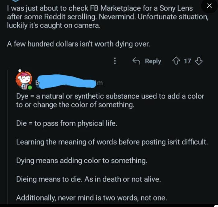 I don't understand how someone can think 120 minutes is the same thing as an hour and 20 minutes. I'm a Senior Staff Writer who writes a wide range of topics, spanning from people's real-life drama to pop culture to funny things I find on the internet. "I was just about to check FB Marketplace for a Sony Lens after some Reddit scrolling. Nevermind. Unfortunate situation, luckily it's caught on camera. A few hundred dollars isn't worth dying over." "Dye = a natural or synthetic substance used to add a color to or change the color of something. Learning the meaning of words before posting isn't difficult. Dieing means to die. As in death or not alive. Additionally, never mind is two words, not one." Post:“Did you know: mammals cannot be green.” Reply by user 1:“Kermit would like a word” Reply by user 2:“Kermit is not a mammal” Reply by user 1:“Lmao of course he’s a mammal his surname is literally ‘the frog’” “The president, and the president alone, has the authority to decide how to allocate funding. Nobody has the right to review or pass judgement on his actions.” Comment 1:“18th century but whatever lol...im from the 19th...” Reply by user 1:“.... I highly doubt you are over 126 years old” Reply by user 2:“was still born before 2000 and definitely not 1809 so what period was i born in again cause it wasnt 20th century or 18th...goofball” Reply by user 1:“being born between 1901 and 2000 means you were born in the 20th century.we are currently in the 21st century .... goofball” Reply by user 2:“I was still born in the 1900 jackass” Reply by user 1:“................ the 1900s are 20th century......How many time will I have to tell you before you check how centuries work ?” “Ladies, it finally happened. I just had a mansplaining so epic it will never be topped. I just had a man ask me why I chose to be a widow. I said "I'm sorry, but that's not something you choose." He said "You just need to open your heart and let someone love you instead of choosing to stay a widow". I said "What do you think widow means exactly?" This man said "A widow is when a woman gives up on dating and stays alone for the rest of her life." I said "That is not what that means". HE SAID...” Comment by user 1:“Poor thing. I'm not eating beef anymore.” Reply by user 1:“The only problem is... beef is in all of my favorite foods (Spaghetti bolognese, hot dogs, hamburgers etc..) so now I don't know what to even eat, lol.” Reply by user 3:“HAMburgers aren’t beef. Neither is hotdogs. They’re pig” Post: "Spanish is a LANGUAGE 🥴🥴🥴🥴 people aren't Spanish 😭🥴" “There’s no thing as 'Rabies', it’s never been proven to exist. Rabid animals are usually starving and in a highly stressed state. I’d wash my wound with CLO2 and not worry about it.” “How about just don’t cheat on your spouse and then they won’t divorce you over infidelity” “Cheating makes marriages stronger, sexual frustration ruins them.” “Proof that airplanes aren't real. We don't have that kind of technology as humans, it's impossible to fly in the air. Throw a feather into the air and it comes down. No way thousands of pounds of metal is able to fly. When you book a flight it's using demonic technology, using demon energy to transport you to your destination. The "X-rays" at tsa transmit signals to your brain to convince you that this demonic technology is actually human technology. I will never fly in a "airplane" the airplanes you think you see are holograms using the same demonic technology. Even if we could somehow fly using non demonic human technology the government wouldn't let us , because it would prove the earth is flat” “The Sun hasn't been invented yet. No we can't make something like that happen. Yes you can pretend you have a formula for what compounds you need, but nothing does what the Sun is said to do. We need something that can have other objects move around it and off the ground going around it. Plus we need it also happening without power leading into it, like an electric powering up to it, etc. All that has to be operating off world and in a vacuum known as space. Very tricky to prove that's what this is that people say it is. Proving is done using experimentation and that's not proven in any way shape or form.” "Why can’t you give a baby under a year honey?" Comment 1:“Am I the only one thinking that honey has to be some sort of like golden formula that you should give your babies as much as possible if the government is trying so hard to push against it? 🤔” Reply (Author):“I was actually thinking kinda the same. I don’t trust the WHO or FDA” Comment 2:“I gave my boys honey before the age of 1. I do not nor will never trust anything that the FDA, WHO, or
