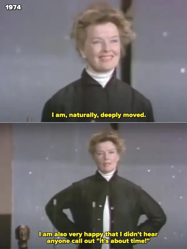 The above photo is from Kate Hepburn's only appearance in Academy Awards history. It was in 1974, and she presented Lawrence Weingarten with the Irving G. Thalberg Memorial Award. Upon approaching the stage, she joked, "I am very happy that I didn't hear anyone call out 'it's about time!'"