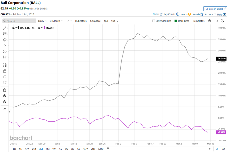 With a market cap of $16.5 billion, Ball Corporation (BALL) is a global manufacturer of aluminum packaging products serving the beverage, personal care, and household product industries. The company produces aluminum beverage containers used for carbonated soft drinks, beer, energy drinks, and other beverages. Companies valued at $10 billion or more are generally considered “large-cap” stocks, and Ball Corporation fits this criterion perfectly. It also manufactures extruded aluminum aerosol containers, reclosable aluminum bottles, aluminum cups, and aluminum slugs for various industrial and consumer applications. NIO Is Outperforming Even as U.S. Stocks Slump: Can the Uptrend Continue? Iran War, Fed Conundrum and Other Key Things to Watch this Week This Stock Has an 18%+ Annual Yield, Pays Monthly, and is Covered by Cash Flow Get exclusive insights with the FREE Barchart Brief newsletter. Subscribe now for quick, incisive midday market analysis you won't find anywhere else. Shares of the Westminster, Colorado-based company have fallen 8.9% from its 52-week high of $68.29. BALL stock has soared 22.2% over the past three months, outpacing the broader Nasdaq Composite's ($NASX) 4.7% decline over the same time frame. BALL stock is up 17.4% on a YTD basis, exceeding NASX's 4.9% decrease. However, shares of the aluminum packaging maker have increased 22% over the past 52 weeks, lagging behind NASX's 27.8% gain over the same time frame. The stock has been trading above its 50-day moving average since late November 2025. Also, it has moved above its 200-day moving average since mid-December 2025. Shares of Ball Corporation climbed nearly 9% on Feb. 3 after the company reported Q4 2025 results that exceeded Wall Street expectations. Adjusted EPS came in at $0.91 and revenue reached $3.35 billion, both surpassing analysts’ forecasts due to stronger global aluminum packaging volumes and favorable pricing. The company also reported net income of $200 million ($0.75 per share) compared with a $32 million loss a year earlier, and highlighted strong growth with Q4 shipment volumes up 6% and 2026 EPS expected to grow 10%+. In comparison, rival International Paper Company (IP) has lagged behind BALL stock. Shares of International Paper have dipped 26.1% over the past 52 weeks and 5.4% on a YTD basis. Despite Ball Corporation’s underperformance relative to the Nasdaq over the past year, analysts remain moderately optimistic about its prospects. Among the 15 analysts covering the stock, there is a consensus rating of “Moderate Buy,” and the mean price target of $70.75 suggests a premium of 13.8% to its current levels. On the date of publication, Sohini Mondal did not have (either directly or indirectly) positions in any of the securities mentioned in this article. All information and data in this article is solely for informational purposes. This article was originally published on Barchart.com
