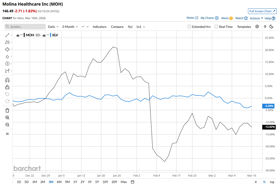 Long Beach, California-based Molina Healthcare, Inc. (MOH) provides managed healthcare services to low-income families and individuals under the Medicaid and Medicare programs and through the state insurance marketplaces in the United States. The company has a market capitalization of $7.5 billion and operates through Medicaid, Medicare, Marketplace, and Other segments. Companies with a market cap between $2 billion and $10 billion are typically referred to as “mid-cap stocks.” Molina Healthcare sits comfortably there, with its market cap exceeding this threshold, reflecting its scale, dominance, and staying power. What Options Traders Expect from Micron Stock After Earnings on March 18 This Dividend King With a 54-Year Dividend Streak Is Down 13% YTD. Time to Buy the Dip? As Oracle Reveals Higher Restructuring Costs, Should You Still Buy ORCL Stock or Stay Far Away? Our exclusive Barchart Brief newsletter is your FREE midday guide to what's moving stocks, sectors, and investor sentiment - delivered right when you need the info most. Subscribe today! The stock touched its 52-week high of $359.97 on April 04, 2025, and is down 59.3% from that peak. Over the past three months, the stock declined 8.9%, underperforming the State Street Healthcare Select Sector SPDR ETF’s (XLV) 1.8% decline during the same time frame. Zooming out, the dynamic stays the same over the longer period. Over the past 52 weeks, the healthcare company’s shares tanked 52.5%, underperforming XLV, which rose 2.9% over the same time frame. MOH has been trading below its 200-day moving average since last year and also below its 50-day moving average since February, reflecting its weak performance and signaling a continued bearish trend. On Feb. 6, MOH stock dropped 25.5% following the release of the company’s Q4 2025 earnings. The company’s revenue grew 8.3% year-over-year to $11.4 billion and topped the Street’s forecasts. However, its adjusted loss per share amounted to $2.75, down from an EPS of $5.05 in the year-ago quarter, and failed to meet Wall Street’s estimates. Additionally, investor confidence was broken due to the company’s full-year revenue guidance coming below analysts’ estimates. When compared to its peer, Centene Corporation (CNC), MOH has underperformed. CNC has declined 40.3% over the past 52 weeks. Wall Street analysts are skeptical of MOH. Among the 18 analysts covering the stock, the consensus rating is a “Hold.” Although the stock trades at a premium to its mean price target of $144.40, its Street-high price target of $180 offers 22.9% upside potential. On the date of publication, Sristi Jayaswal did not have (either directly or indirectly) positions in any of the securities mentioned in this article. All information and data in this article is solely for informational purposes. This article was originally published on Barchart.com