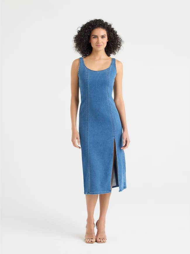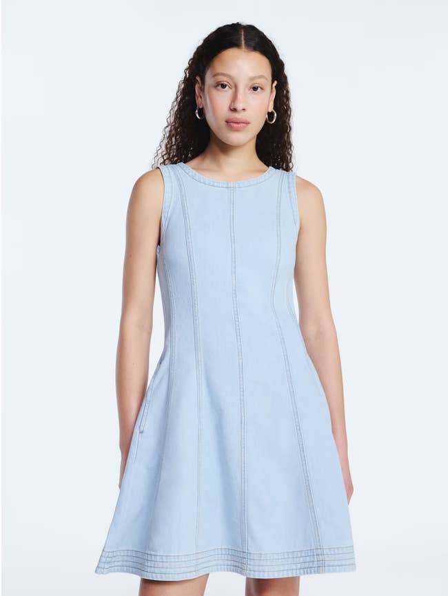 Promising review: "Sexy sleeveless denim panel mini dress. There is no stretch so if you are ample chested it may be a little snug in the bust area. Length wise it is perfect and is not really a true mini. I am 5'7" and it is a little above the knees. If you are a denim girl, this dress will definitely up your game. Can be worn in all seasons. Throw on a jacket or a cardigan and you are good to go." —ooodles4u