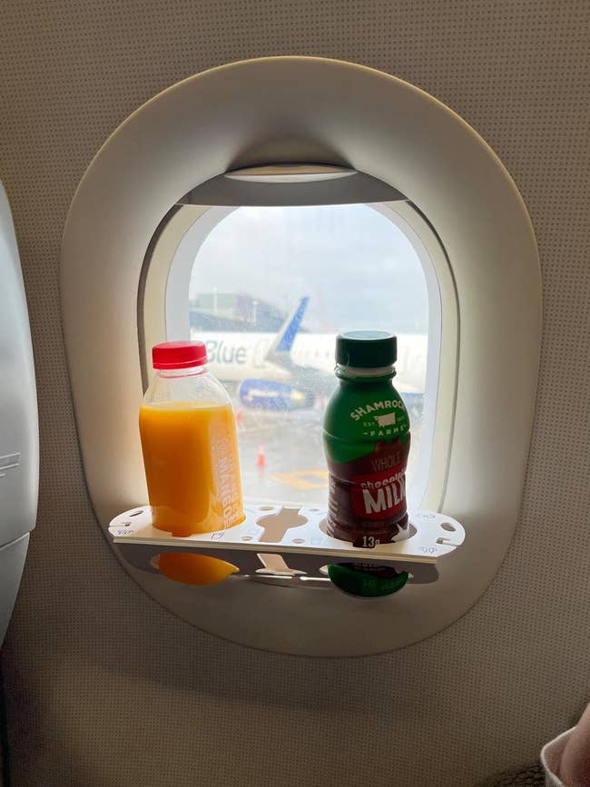Promising review: "This little gadget made window seat life so much more roomy! I’m a plus-size girlie, and I normally book economy, so anything that will give me extra legroom on a flight I’m a sucker for! It works just like the directions say and is so light that I almost forget it’s in my bag. It’s also stronger and more stable than it looks; it held my phone, earbuds, and two cups easily. The glasses holder was so convenient when I was ready to take a nap and didn’t have to worry about forgetting anything in the seat pocket." —ashley-britt