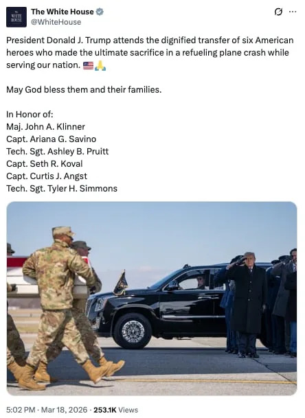 The families of service members killed in the Middle East sought privacy during the dignified transfer of their remains in the aftermath of one of President Donald Trump’s grim cash grabs. Trump, 79, traveled to the Dover Air Force Base in Delaware on Wednesday to honor the six military members who died last week after a refueling tanker crashed in western Iraq, raising the death toll of American troops in the Iran war to at least 13. Fox News’ John Roberts said during the day’s broadcast of America Reports that the troops’ kin asked for the transfer to remain private, banning cameras from capturing Trump welcoming the fallen service members back home. The six service members killed on March 12 have been identified by the Pentagon as Maj. John Klinner, 33; Capt. Ariana Savino, 31; Tech. Sgt. Ashley Pruitt, 34; Capt. Seth Koval, 38; Capt. Curtis Angst, 30; and Tech. Sgt. Tyler Simmons, 28. They were from Alabama, Indiana, Kentucky, Ohio, and Washington state. It marked the second time that Trump attended the solemn military ritual since waging war on Iran last month. The second dignified transfer notably had more muted coverage. Though the White House did share photos of the solemn ceremony on X. In the post, the president was named first. The accompanying image showed Trump saluting and soldiers carrying a coffin. The request from families followed Trump’s controversial appearance during the dignified transfer of six other service members last week, when he wore a white hat embroidered with “USA” in gold as coffins covered in American flags were solemnly carried from an aircraft to a waiting vehicle in Dover. Trump doubled down on the shocking display of disrespect by later using images of himself from that dignified transfer to beg for cash from supporters. A MAGA PAC named Never Surrender Inc. used a shot of Trump saluting one of the coffins to promote a private newsletter group receiving “national security briefings.” “This is President Donald J. Trump,” the email read. “For the very first time ever, I’m opening up spots on the National Security Briefing Membership. Very few spots remaining!” The email linked to a website by Never Surrender Inc. that seeks contributions of as much as $1,000 and beyond to support the “MAGA agenda.” Trump proceeded to triple down on the controversy by snapping at a reporter who confronted him about it on Sunday. “Your PAC put out a fundraising email a couple of days ago, and it’s being criticized for using official White House photos of you at the dignified transfer,” a female reporter began, before being cut off by Trump. “Well, I was at the dignified transfer, unlike a lot of people,” he said. “Do you think it’s an appropriate email to send?” the reporter pressed. “Yeah, I do,” Trump replied. “I didn’t see it. I mean, somebody puts it up. We have a lot of people working for us.” After learning that the reporter was with ABC News, the president fumed at the outlet as “one of the worst, most fake, most corrupt” organizations. “I think they’re terrible. I don’t want any more from ABC,” he said as he moved on to take questions from another reporter. Later in the same press gaggle, another reporter asked Trump for comment on the six service members who were killed. The president ignored the question and said, “Who else?” to the other journalists. Trump did not attend a dignified transfer for one service member killed in an Iranian attack on an air base in Saudi Arabia. His schedule and press pool reports showed that he was traveling back to Washington, D.C. from Florida at the time.