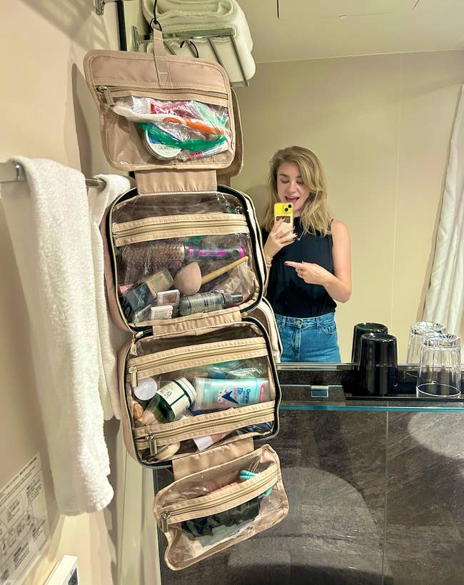 BuzzFeed writer Emma Lord says, "I will scream this thing's virtues on every corner of this earth. I used this on an eight-day international trip. It fit a veritable arsenal of products — all of my skincare, makeup, hair supplies, toothbrush, toothpaste, and deodorant were wedged in the different pockets, and still compacted easily and went right into my carryon backpack. It made setting up at the hotel a two-second process of hanging it up and having all my products instantly accessible to me and easy to put away. I cannot imagine traveling without it, especially now that I've used it on a multi-city trip where it was so handy to fold back up and take through several hotels. At one point, I forgot to properly close a lotion, and it exploded a bit, and the bag was super easy to clean from the inside!"