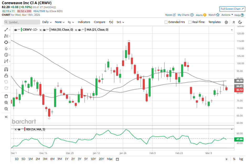 CoreWeave (CRWV) continues to deliver strong top-line growth, driven by rising demand for artificial intelligence (AI) infrastructure. As hyperscalers and AI developers invest in high-performance computing resources, the company’s cloud platform, optimized for accelerated computing, remains well-positioned to capture this expanding market. Despite these favorable demand dynamics, CRWV stock currently trades approximately 57% below its 52-week high of $187. This reflects investor concerns around profitability and the company’s significant increase in capital expenditures. As Meta Stock Dips Near $600 Levels Should You Buy or Stay on the Sidelines? Massive Meta Platforms Layoffs Could Be Coming. Why Did META Stock Gain on the News? SoFi Stock Is on Fire Sale, But Is It Too Cheap to Buy Here? Markets move fast. Keep up by reading our FREE midday Barchart Brief newsletter for exclusive charts, analysis, and headlines. CoreWeave is experiencing strong demand across a diversified customer base, including hyperscalers, enterprises, and AI-native firms. As AI models become more complex and adoption accelerates, the need for CoreWeave’s GPU-intensive infrastructure continues to expand. The company’s strong financial performance reflects this momentum. In 2025, CoreWeave generated more than $5.1 billion in revenue, representing a 168% year-over-year (YOY) increase. Its contracted revenue backlog rose to $66.8 billion, marking significant growth. At the same time, active power capacity exceeded 850 megawatts (MWs), reflecting CoreWeave’s expanding infrastructure footprint. Customer engagement trends further support CoreWeave’s growth trajectory. The number of customers committing at least $1 million in annual spending on CoreWeave’s platform jumped 150% in 2025. In addition, customers are increasingly adopting multi-product solutions, a shift that enhances revenue potential while strengthening long-term customer relationships. CoreWeave is expanding its product portfolio through organic development and strategic acquisitions, while simultaneously strengthening its platform capabilities. The company is positioning itself as an integrated provider, allowing customers to operate seamlessly across compute, storage, software, and development tools within a unified environment. This multi-product approach is beginning to show measurable traction. A growing share of high-value customers is adopting services beyond CoreWeave’s core GPU infrastructure, with storage solutions emerging as a key area of uptake. In parallel, cross-selling efforts are contributing meaningfully to overall growth, indicating increased customer engagement and higher lifetime value per client. Looking ahead, CoreWeave is evaluating additional monetization opportunities, including expanding its cloud offerings beyond its owned data-center footprint into a broader ecosystem. With a substantial portion of its 2026 capacity already committed, the company’s near-term priority is to scale its infrastructure to meet both immediate demand and longer-term growth requirements. Despite its strong growth outlook, CoreWeave’s aggressive investment strategy is putting near-term margins under pressure. The company is rapidly expanding its infrastructure to meet rising demand, a move that requires significant capital deployment. CoreWeave has indicated that capital expenditures for 2026 are expected to reach at least $30 billion, representing a more than twofold increase compared with 2025 spending levels. Although this elevated investment is aimed at supporting long-term growth and enabling access to higher-margin opportunities, it is likely to constrain short-term profitability and may limit near-term upside in CRWV stock. Wall Street analysts currently maintain a “Moderate Buy” consensus rating on CoreWeave. While the company is set to benefit from strong structural demand and execution on growth initiatives, concerns around capital intensity and margin compression are why a few analysts are not endorsing CRWV stock. CoreWeave has an average price target of $118.17, implying potential upside of about 46% from current levels. CoreWeave is capitalizing on one of the most significant technological shifts of this decade as demand for AI infrastructure continues to accelerate. For investors with a long-term horizon, the recent pullback in CRWV stock presents an opportunity to gain exposure to this structural growth trend. CoreWeave is well-positioned in a rapidly expanding AI infrastructure market, supported by strong demand dynamics, sustained revenue growth, and deepening customer engagement. These factors strengthen a constructive long-term outlook for the stock. At the same time, CoreWeave’s capital-intensive business model introduces near-term risks. Elevated capex requirements may weigh on profitability and contribute to volatility in stock performance. As a result, more conservative investors may prefer to wait for more visibility into the company’s path to sustainable profitability. On the date of publication, Amit Singh did not have (either directly or indirectly) positions in any of the securities mentioned in this article. All information and data in this article is solely for informational purposes. This article was originally published on Barchart.com